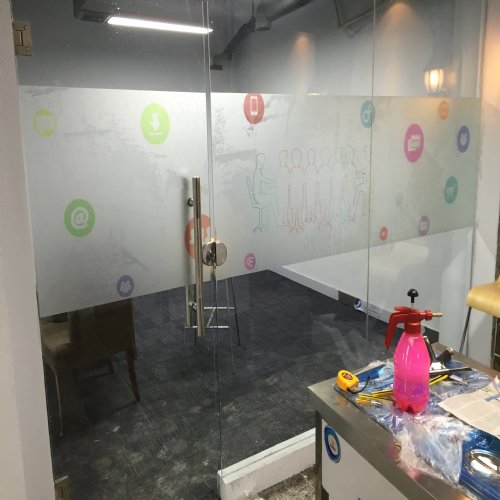 办公室隔断刻logo。专业贴玻,可抽条,刻字刻花 即时贴 玻璃