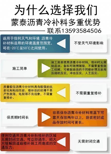 ① 全天候型修补材料:冷补料适用的环境温度范围宽,可在-30℃至50℃之间适用,无论雨天、雨雪或者晴天均可施工