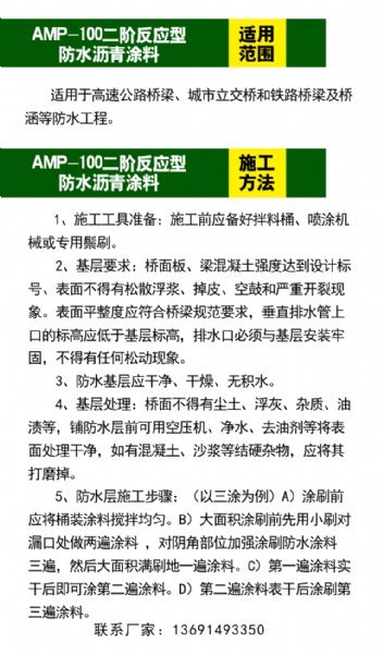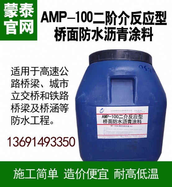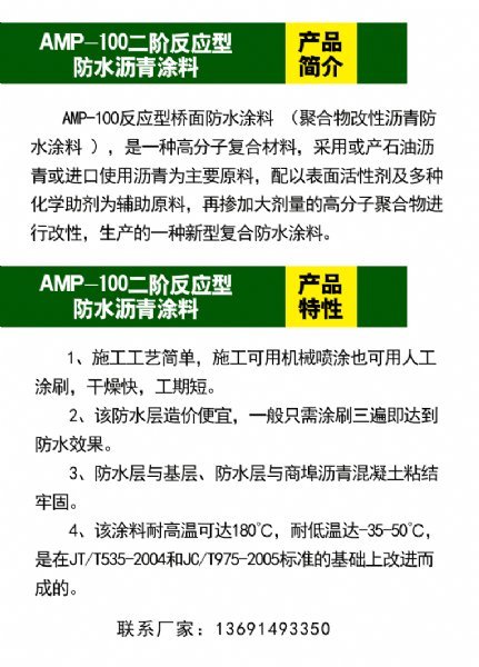 AMP-100反应型号桥面防水涂料 (聚合物改性沥青防水涂料 ),是一种高分子复合材料,采用或产石油沥青或进口使用沥青为主要原料,配以表面活性剂及多种化学助剂为辅助原料,再掺加大剂量的高分子聚合物进行改性,生产的一种新型复合防水涂料。