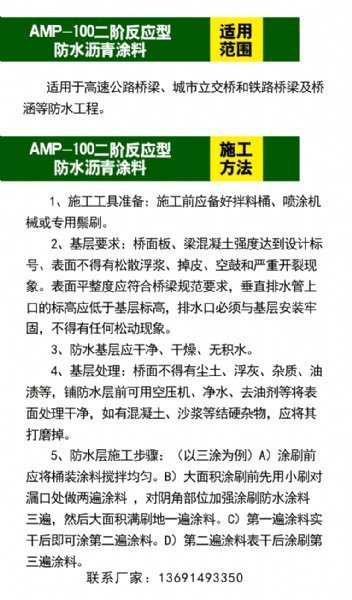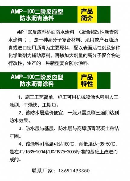 AMP-100二阶反应型桥面防水粘接剂采用特种国产沥青或进口石油沥青为主要原料,配以各种表面活性剂及多种化学助剂、SBS热塑性橡胶为辅助原料,在掺加大剂量的高分子聚合物树脂进行改性,生产的一种新型复合防水涂料。经交通部公路工程检测中心测试,AMP-100二阶反应型桥面防水粘接剂全部技术指标均符合JC/T975-2005标准要求;符合JC/T408-2005(公路桥涵施工技术规范),AMP-100二阶反应型桥面防水粘接剂能将基路(桥)和路(桥)面溶合为一体,形成一个高弹改进型塑性承重、防水和抗剪的整体,从而大幅提高道桥路性能,延长路桥尤其是陡坡弯道重载路面的使用寿命可达12年以上。