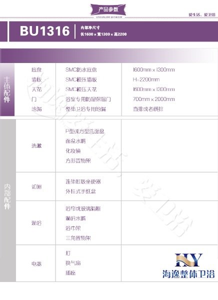 本整体浴室包括底盘、墙板、天花板、门、座便器、洗面盆、化妆镜、龙头、浴巾架、浴帘、手纸盒、置物架、插座、换气扇,防水灯等配件,能满足洗浴、入厕、洗漱、梳妆等功能。