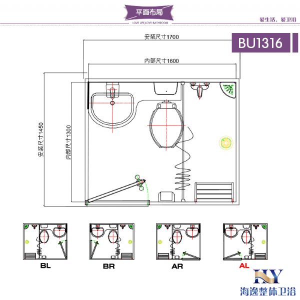 本整体浴室开门方向分为4种,布局设计各不相同,但所需占地面相等,可以做四面墙板或者两面墙板两面玻璃,其毛坯尺寸为排除卫生间立管所剩空间尺寸。 *小安装空间的长宽在产品长宽上加12cm,15cm*佳,卫生间内部高度一般是2.2米,内高*低可以做到2米