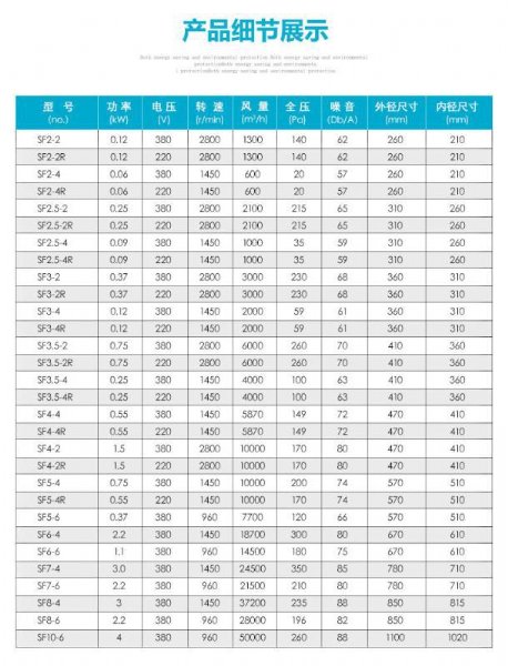 本系列风机叶轮直径由小到大共有三十个规格,每一规格风机的叶片数都为4片,叶片角度有15°,20°,25°,30°,35°五种,参数范围广,风量826-67892?/h,风压39Pa-474Pa.