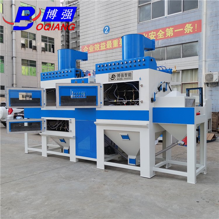 陕西宝鸡钛板全自动喷砂机能够有效清理钛板表面,设备利用压缩空气冲击和切削钛板表面的作用,使钛板的表面获的一定的清洁度和不同的粗糙度,使钛板表面能得到改善,因此提高了工件的抗疲劳性,增加了它和涂层之间的附着力,延长了涂膜的耐久性,也有利于涂料的流平 热处理后的氧化皮、残盐、残油等;黑(有)色铸造件的氧化皮、型砂等;