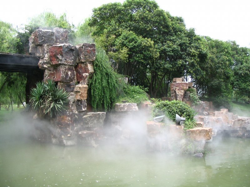 喷雾喷泉常用的造雾方法, 一种是把水以低压喷于高速流动的气流中,使输出的小水滴被粉碎而形成雾。 这种方法的能耗很大, 而且,当需要很大的雾量时, 所需的气流量非常大,设备成本非常高,因此很难作出大规模商业用途;另一种方法是把水加热成蒸汽,将其喷到冷冻的低速气流中而使其凝结成雾,但此方法制冷能耗也很大,难以实现大量制雾。