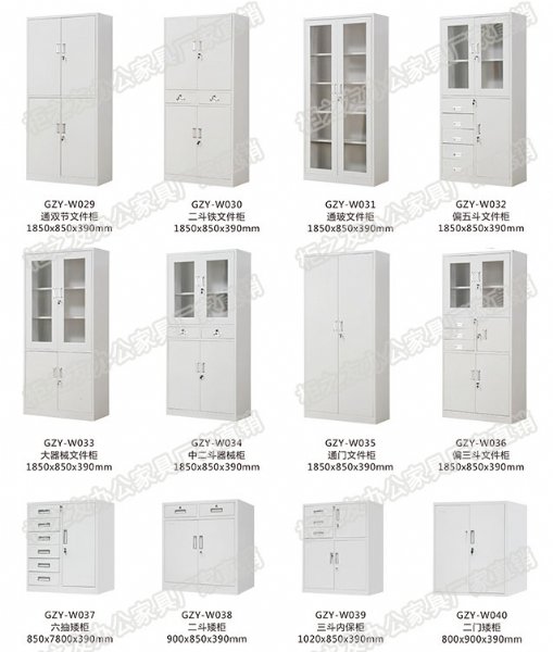 对开门通门文件柜、对开门通玻文件柜、大器械文件柜、等器械文件柜、中二斗文件柜、通双节文件柜、偏三斗文件柜、对开门通门凭证柜、五节柜、活动文件柜、卡箱文件柜等。