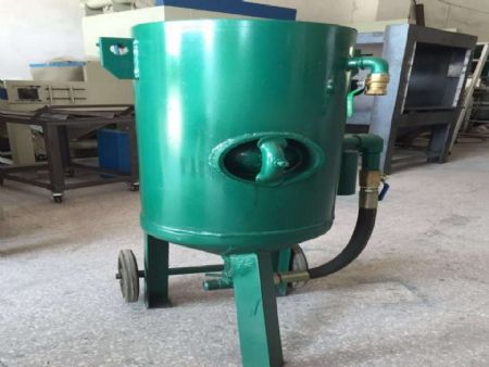 压入式干喷砂机是以压缩空气为动力,通过压缩空气在压力罐内建立的工作压力,将磨料通过出砂阀,压入输砂管并经喷嘴射出,喷射到被加工表面达到预期的加工目。在压入式干喷砂机中,压缩空气既是供。