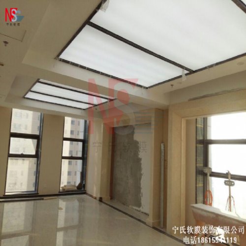 6.开灯孔:在灯孔的位置上做好记号,把PVC灯圈小心准确地粘在软膜的底面,待牢固后把多出的天花去除即可。