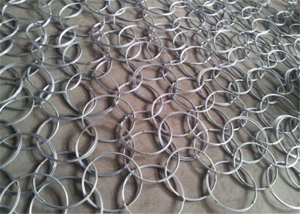 环形网均采用直径3Mm、抗拉强度不低于1770MPa的高强度钢丝盘结数圈成环,并相互套接而成,其环孔直径一般为300、350、400mm。盘结圈数根据拦石网型号的不同而不同,成品规格一般为5X3/4/5/6/7m。环形网单个环由单根钢丝盘结而成,两端头搭接长度在100mm以上,盘结而成的环用钢质或铝合金