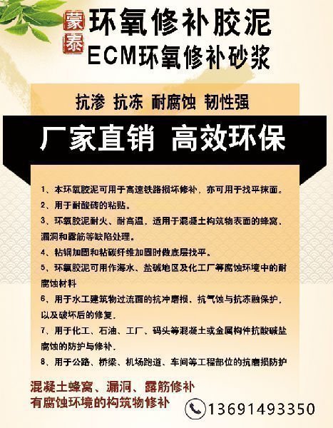 1、本环氧胶泥可用于高速铁路损坏修补,亦可用于找平抹面。