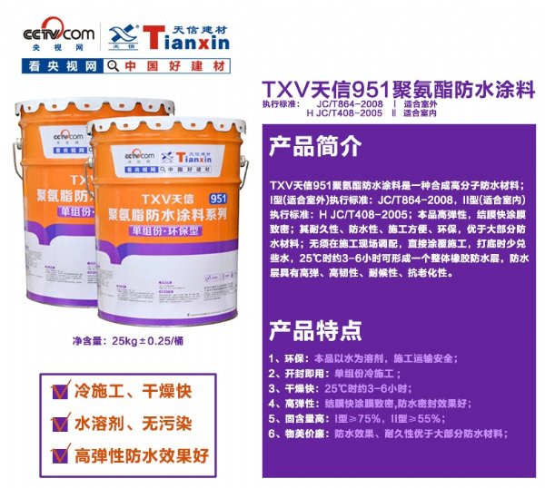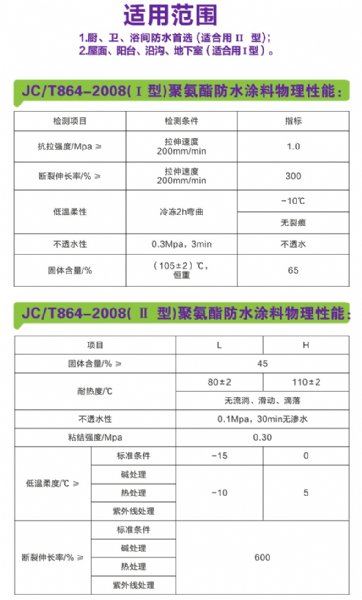 催化剂、无水助剂、无水填充剂、溶剂等,经混合等工序加工制成的单组分聚氨酯防水涂料。该类涂料为反应固化型(湿气固化)涂料、具有强度高、延伸率大、耐水性能好等特点。对基层变形的适应能力强。聚氨酯防水涂料是一种液态施工的单组分环保型防水涂料,是以进口聚氨酯预聚体为基本成份,无焦油和沥青等添加剂。它是空气中的湿气接触后固化,在基层表面形成一层坚固的坚韧的无接缝整体防膜。