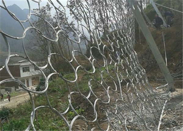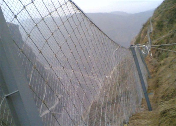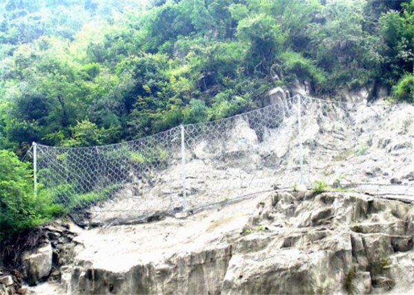 工字钢柱,上下拉锚绳,减压环,底座及上下支撑绳等部件构成.系统由钢柱和钢绳网联结组合构成一个整体,对所防护的区域形成面防护,从而阻止崩塌岩石土体的下坠,起到边坡防护的作用。