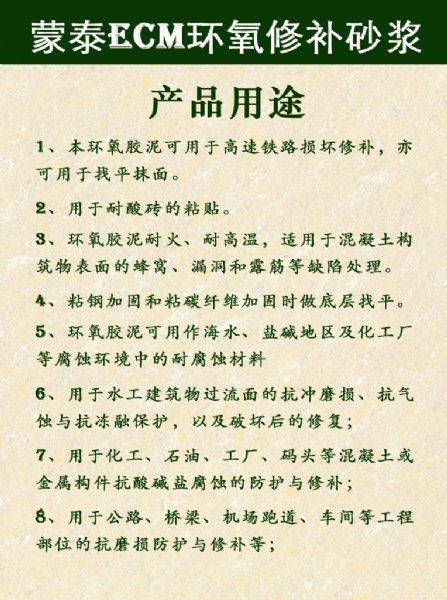1、本环氧胶泥可用于高速铁路损坏修补,亦可用于找平抹面。