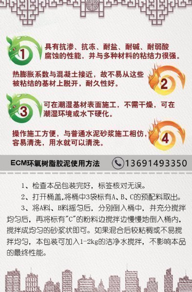 3、环氧胶泥耐火、耐高温,适用于混凝土构筑物表面的蜂窝、漏洞和露筋等缺陷处理。