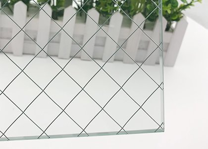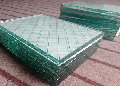 夹丝玻璃是采用压延工艺生产出来的一种安全玻璃。成卷的金属丝网由供网装置展开后送往熔融的玻璃液中,随着玻液一起通过上、下压延辊后制成夹丝玻璃。夹丝玻璃中的金属丝网网格形状一般为方形或者菱形格,而玻璃表面可以带花纹(及香梨),也可以是光面。夹丝玻璃厚度一般为6-16mm(不含中间丝的厚度),安全玻璃可在建筑物顶棚等场合使用。