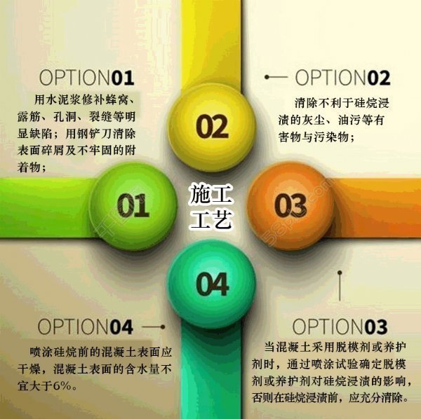 硅烷浸渍的喷涂施工工艺参照《海港工程混凝土防腐蚀技术规范》JTJ275-2000附录E 混凝土硅烷浸渍施工工艺及测试方法E.1 施工工艺。