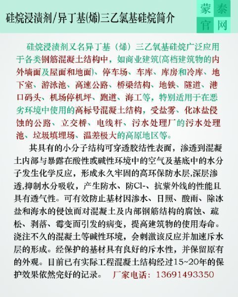 硅烷浸渍液,化学名称是异丁基(烯)三乙氧基硅烷液体,硅烷浸渍剂为无色透明液体,涂装后不改变混凝土本色,且与混凝土基材有良好的附着力浸渍液可渗透入混凝土内部,形成防水、透气的防护层,耐久性能优良,抗紫外线性能较好,透气性优异,对于海水、盐雾蚀、融雪剂、冻融对混凝土的侵蚀有优良的防护作用。
