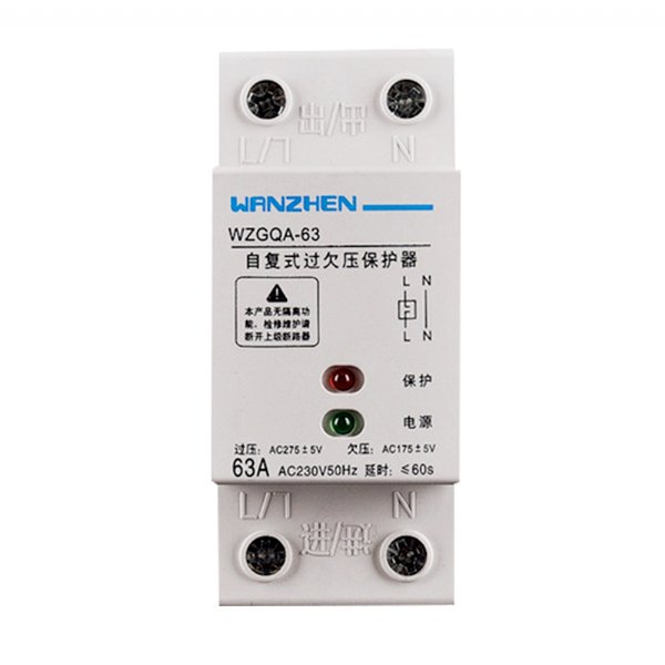 WZGQA-63智能自复式过欠压保护器适用于单相交流电压220V,频率50Hz,额定工作电流60A及以下的用户或负载。作为由中性线、断线与中性线错接,三相负载严重不平衡、线阻过大、错相或高次谐波等状况引起单相过电压时,自动断开电源,防止有电设备损坏。从而实现对用电设备的保护。
