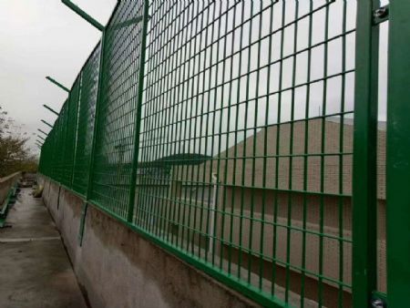 监狱巡逻道护栏由Y型立柱,框架网片,V型网片,刺丝滚笼和斜撑组成。立柱为60*60*3厚的矩形管,边框为30*50*2的矩形管,金属网片为400丝的