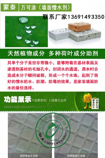 防水性能优异。经万可涂处理过的墙面尤如穿上了一件憎水的外衣,雨水打在墙上呈水珠滚落,有类似荷叶滚水珠的效果,墙面将始终处于干燥状态,因而具有优异的防水、防霉、防泛碱、抗风化功能。