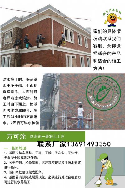 质量可靠、耐久性好。万可涂憎水剂配方独特,具有比其它同类产品更为优异的耐久性能;此外,该憎水剂能渗透到墙内一定深度,因而受紫外线照射及大气老化影响较小,使用寿命长。仪征化纤多幢住宅楼,东西山墙渗水,长期得不到解决,使用本品喷涂两遍就“药到病除”。苏州孔庙的围墙上曾用国产“八五一”防水剂,一年积灰、剥落、褪色;还曾用进口产品——美国唐康宁公司和日本联合生产的“二四九九”防水剂照样三年积灰,四年褪色,失去防水防污功能