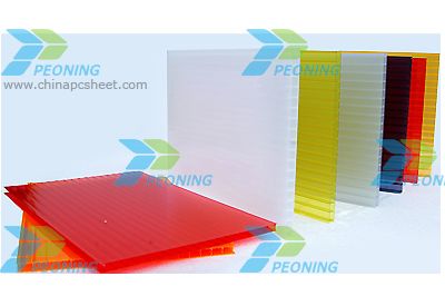 ● 隔热性: PC阳光板属线膨胀系数较小的合成树脂之一。板材的不同方向线膨胀系数略有不同,平均在0.065mm/m.℃。PC阳光板的热传导率与一般合成树脂差异很大,是玻璃发1/4,铁的1/300,铝的1/1000,铜的1/12000,属保温性良好的材料。多层中空阳光板隔热效果尤佳。