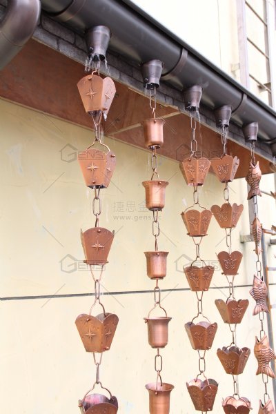 排水系统,它的设计源于日本,几百年前日本人习惯于收集屋面的雨水,并用链状的风铃把雨水引流下来存放于容器之中做为生活用水使用。随着时间推移和社会的进步,人们开始对集水的容器有了美观的要求,因此,铜雨水链作为集水容器和装饰品出现在人们的生活当中,它主要用于建筑和庭院的装饰。与其它传统的