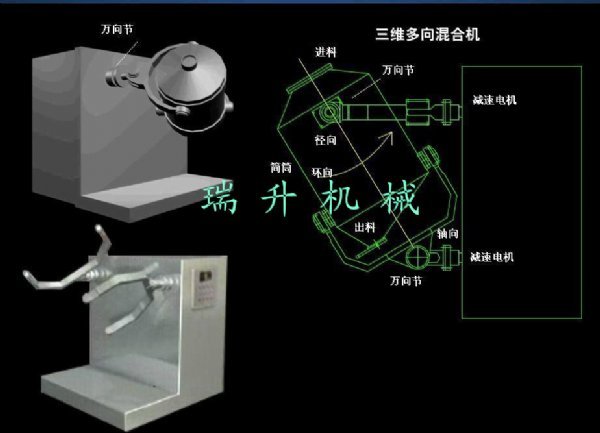 三维混合机原名三维摆动混合机,又称振荡式混合机,是目前国内先进的一种粉体混合设备,该机用于制药、化工、轻工、电工、机械、矿冶国防工业及各科研单位的粉状,颗粒状物料的高均匀度的混合。