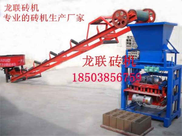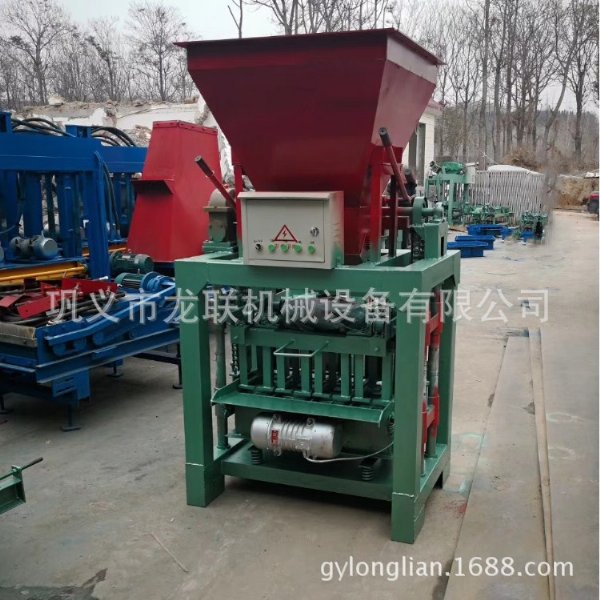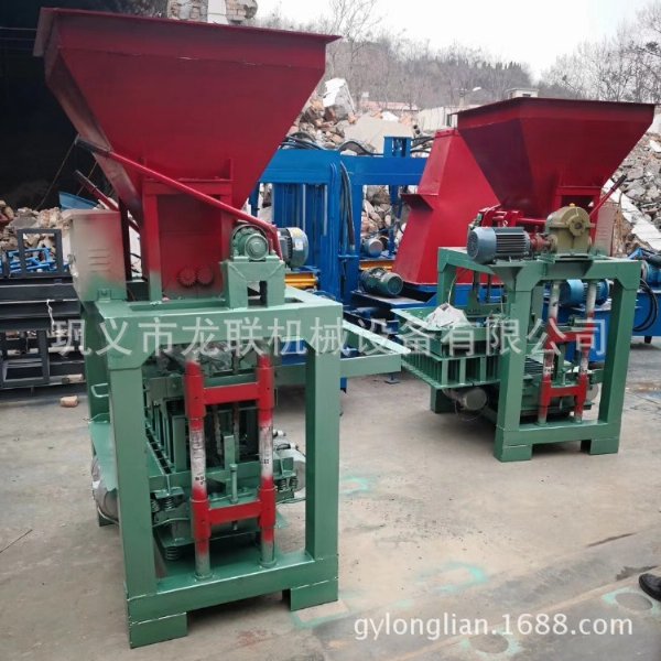 巩义龙联小型半自动带料斗4-35C砌块制砖机原材料科学配比:粗料70%,细料20-22%,水泥8-10%,加水搅拌,通过制砖机械高压压制出