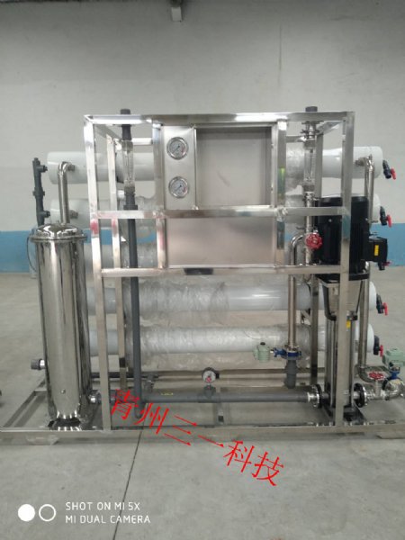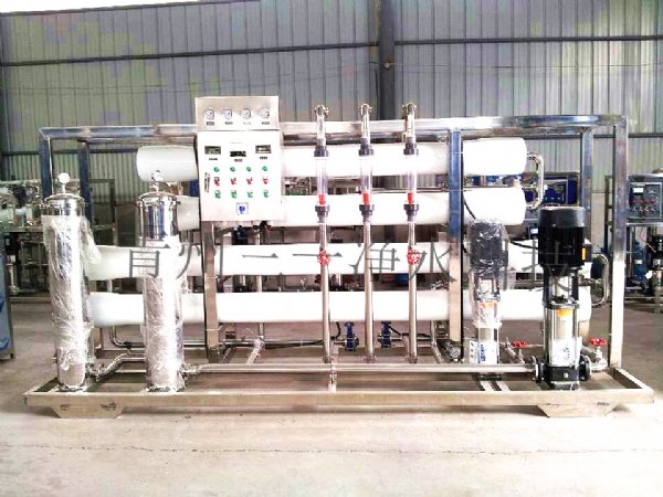 纯净水设备中设计了一种反渗透膜。膜两侧的压力不同,通过两侧的压力为动力,压迫原水通过反渗透膜,盐的浓度低的会向浓度高的盐方向渗透,能够达到的平衡状态下,就是液体的渗透压。当含有的盐水一侧的压力对于另一侧的渗透压力时候,就会发生反方向的流动,就产生了反渗透过程。