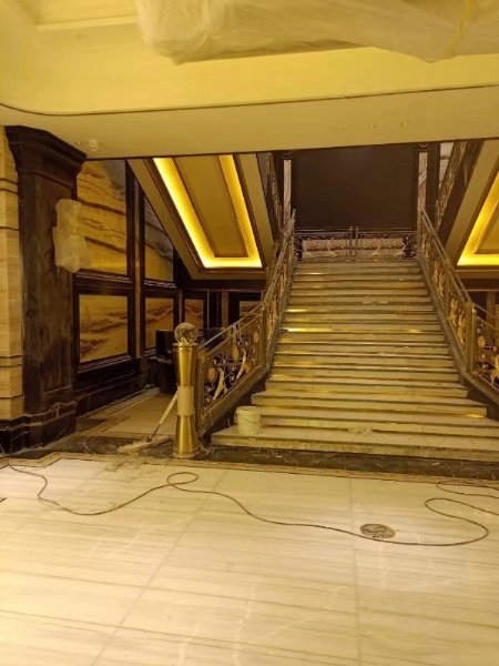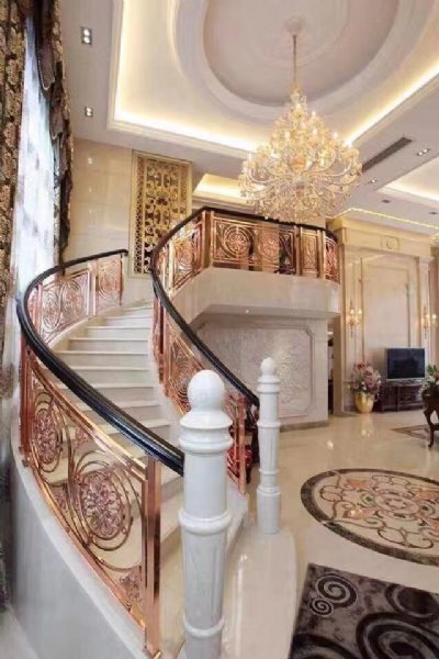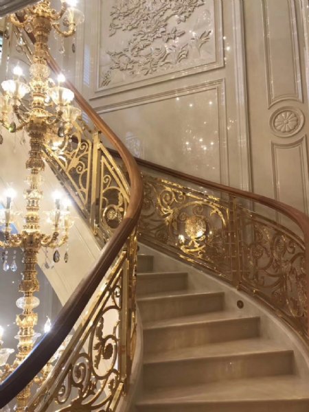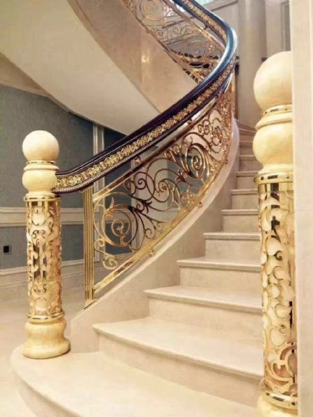 ,雕刻镂空出各种花纹,根据楼梯的形式进行护栏的设计 ,我们叫做铜铝雕刻护栏 ,平台上带弧形的我们叫弧形铜铝雕刻护栏!在表面上可电镀古铜色和K金色。铜铝雕刻楼梯护栏独特的风格,高档的光泽,精美的造型,高贵典雅的品位而被广大用户所认可,为新世纪城市建筑、酒店、宾馆、豪华别墅、娱乐场所装饰、时尚住宅的装饰
