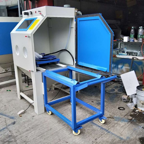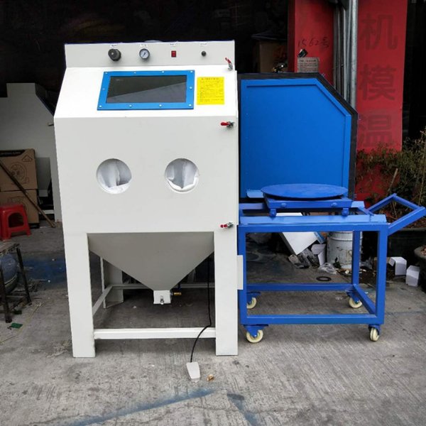 2、加装活动台车和转盘,操作时仅需将工件放在台车转盘上,然后 将推入机内即可从事喷砂作业,十分简单省力,可加装定时