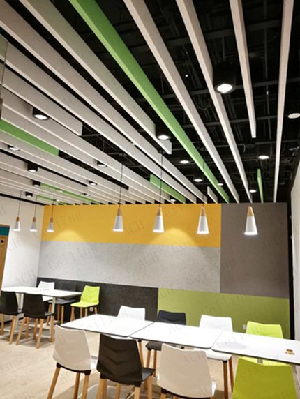 玻纤板的吸声数NRC在0.85左右,声波在其表面不会产生波反射,可有效控制和调整室内混响时间,降低噪间,改善音质。
