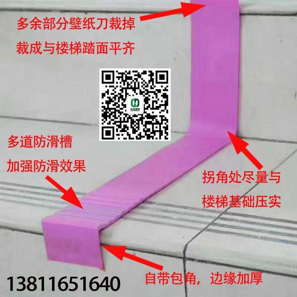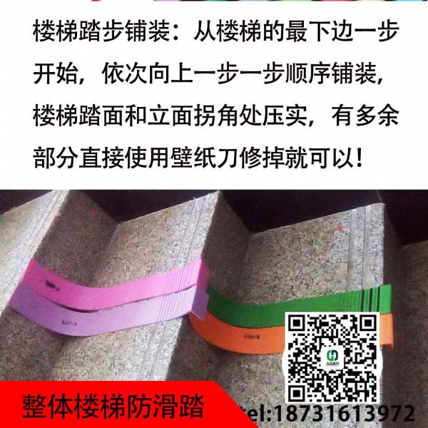 粘接时从*下边一步开始上向上粘接,我们的踏步肯能要比实际的楼梯平面加上立面宽一点,没关系!粘好楼梯踏步后把多余的部分用壁纸刀裁掉就可以了!全部粘好等到24小时以后就可以正常使用了!
