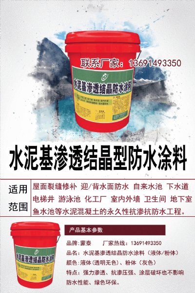 产品性能: ○双重的防水性能:本产品所产生的渗透结晶,除了能够深入到混凝土结构内部堵塞结构孔缝外,作用在混凝土的构基面的涂层也具有很好的抗裂抗渗作用。 ○长久的自我修复性能:本产品防水涂层良好的粘结力,与混凝土结构基面可融为一体,所以,防水涂层的防水作用与结构的寿命同样长。同时活性化学物质多年以后仍能被水激活,不断生长出新的渗透结晶物,来弥补、修复因裂缝所带来的渗漏,具有长久的防水性能。 ○抗渗微晶防水剂具有快凝、早强、刚而不脆的特性:本产品的固化物虽是刚性的,但不会发脆、开裂。特别透宜于带水堵漏的防水工程。 ○施工简单:只需要在混凝土内部的胶凝材料按照一定比例添加内掺,即可达到微晶防水效果。 ○符合环保标准,*无公害。 ○同时具有防腐、耐老化、保护钢筋的作用。 ○掺入