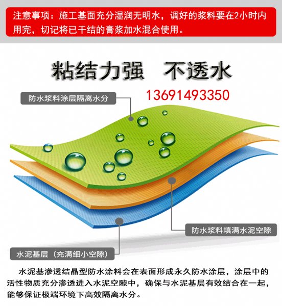 砂浆、素水泥灰中的环保型固体粉状高效防水特种新材料。 在防水施工后即使有微量毛孔渗水,随着渗透结晶量逐步增加,水流中结晶物浓度加大,水流会由流淌或点滴逐步变成不淌不滴的凝水,湿面逐渐收小,常温下,15天后水迹逐渐消失,基面基本达到干燥,时间越长,效果越明显。借助渗透作用,能和混凝土结合为整体,可以达到长久性的防水、防潮和保护