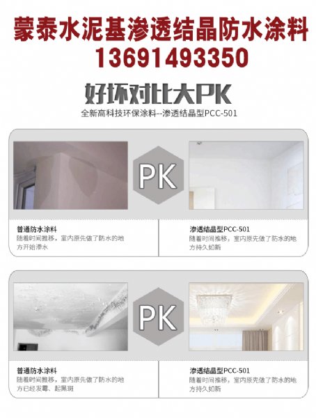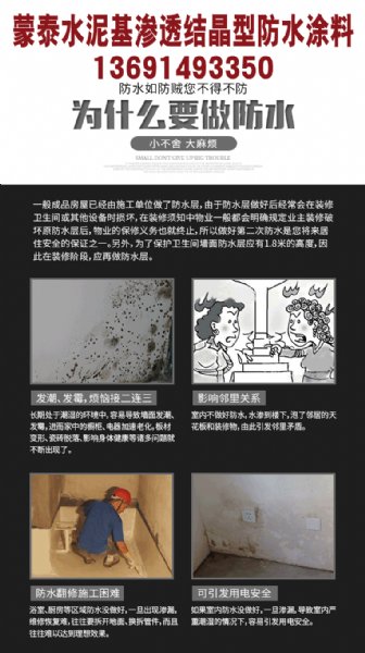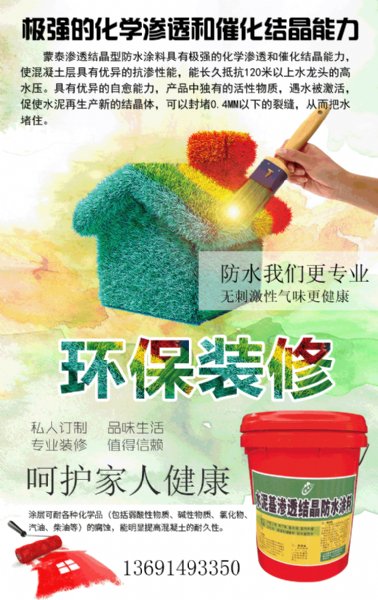 砂浆、素水泥灰中的环保型固体粉状高效防水特种新材料。 在防水施工后即使有微量毛孔渗水,随着渗透结晶量逐步增加,水流中结晶物浓度加大,水流会由流淌或点滴逐步变成不淌不滴的凝水,湿面逐渐收小,常温下,15天后水迹逐渐消失,基面基本达到干燥,时间越长,效果越明显。借助渗透作用,能和混凝土结合为整体,可以达到长久性的防水、防潮和保护