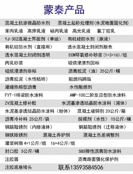 产品性能: ○双重的防水性能:本产品所产生的渗透结晶,除了能够深入到混凝土结构内部堵塞结构孔缝外,作用在混凝土的构基面的涂层也具有很好的抗裂抗渗作用。 ○长久的自我修复性能:本产品防水涂层良好的粘结力,与混凝土结构基面可融为一体,所以,防水涂层的防水作用与结构的寿命同样长。同时活性化学物质多年以后仍能被水激活,不断生长出新的渗透结晶物,来弥补、修复因裂缝所带来的渗漏,具有长久的防水性能。 ○抗渗微晶防水剂具有快凝、早强、刚而不脆的特性:本产品的固化物虽是刚性的,但不会发脆、开裂。特别透宜于带水堵漏的防水工程。 ○施工简单:只需要在混凝土内部的胶凝材料按照一定比例添加内掺,即可达到微晶防水效果。 ○符合环保标准,*无公害。 ○同时具有防腐、耐老化、保护钢筋的作用。 ○掺入