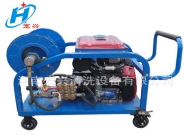 下水道清洗机用于疏通、清除管道中的堵淤和污物。它以配置燃油机(或者电动机)为动力带动高压泵,利用高压水射流束在喷孔产生的压力的反作用力推动喷头并带动