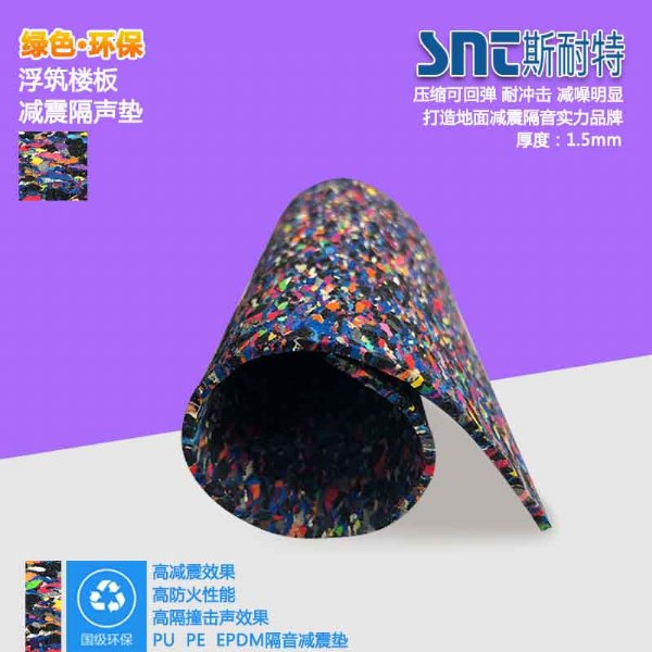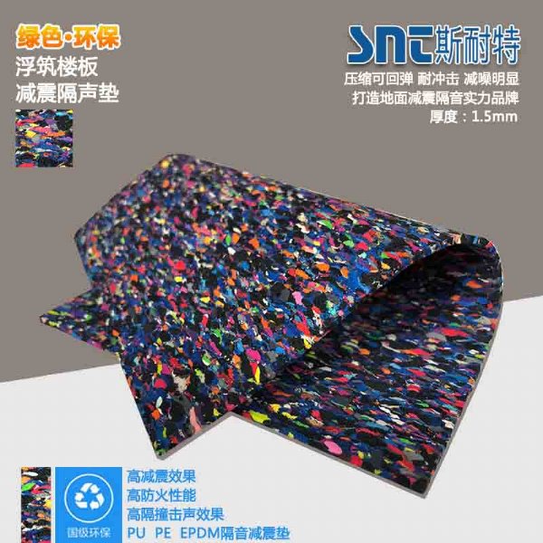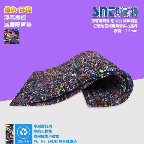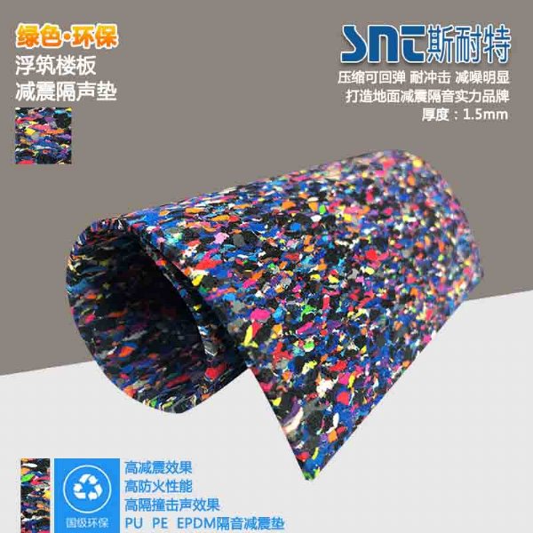 粘合剂及其他化工原料组合并通过高温高压模压而成型;用于潮湿和干燥的声学浮筑楼板构造中,能非常有效的降低楼层物体之间撞击产生的各种频率振动与噪声的影响。
