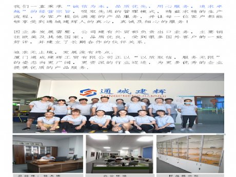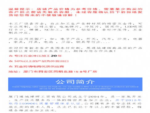 厦门通城建辉工贸有限公司成立于2004年,是一家集开发.生产技术服务为一体的精密五金加工企业,并于2013年取得ISO9001质量管理体系认证,公司拥有多名技术功底扎实的技术人员,从业已长达十六年以上的丰富经验,精通各种五金加工技术. 本工厂设备齐全,自主加工生产各种材质的精密五金件,可定制,公司主营: