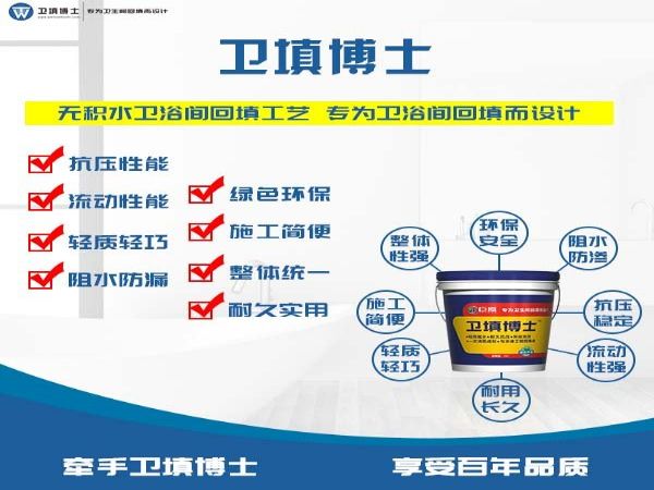 H-100W卫填博士具有轻质低收缩、抗渗抗压、施工简便、环保高效,整体浇注成型,填充工艺可以达到防渗、防漏、防臭的要求,彻底解决了传统回填材料收缩沉降、渗漏、异味以及施工复杂等的缺陷,填补了我国卫浴间回填高新技术材料的市场空白。