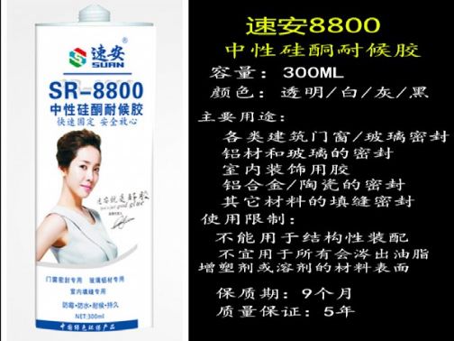 硅酮胶,质量优异,耐候持久.此产品为单组分,广泛应用于各种门窗密封具有优异的性能,对金属,玻璃,混凝土,