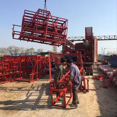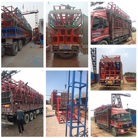 4、吊篮:是物料的主要工作机构,由型钢组焊而成。侧柱上有滚轮,可沿立柱主弦滚动,起导向作用。下有用