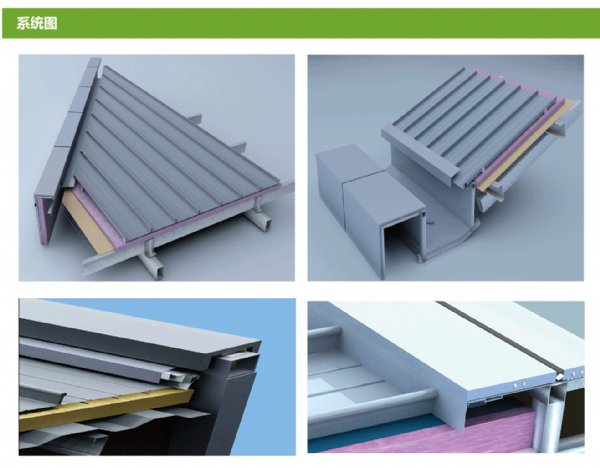 铝镁锰板的安装系统直立锁边系统是一个传统的铝镁锰板安装系统,通过使用专业的立边和咬合设备,在沿着板条长度方向上将两块板的立边进行咬合,从而将屋面或墙面连接成为一个整体。系统不需要打胶,100%结构性防水。这个系统可以节省很多安装时间,尤其对于面积较大的屋面或墙面,提供了一个有效降低成本的方法。另外,直立锁边系统也非常适合气候严酷的环境,如强风、雨雪较大的地方。直立锁边系统的立边高度为65mm,使建筑物呈现出一种具有韵律感和现代感的外观