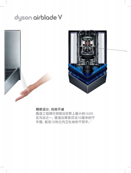 Dyson Airblade V 小巧全能的Dyson Airblade™ 干手技术,厚度仅达10厘米的干手器,10秒之内卫生地吹干双手。