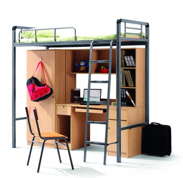书桌和梯架组成。书柜和衣柜连接在床架床腿内侧,书桌将书柜、衣柜连在一起,床架有书柜的一头安装有梯架,床架的另一头与梯架同侧有护栏,书桌的桌面下有键盘支架和抽屉架。由于床是立体空间组合,不仅节省了空间,而且整齐美观,又便于管理。