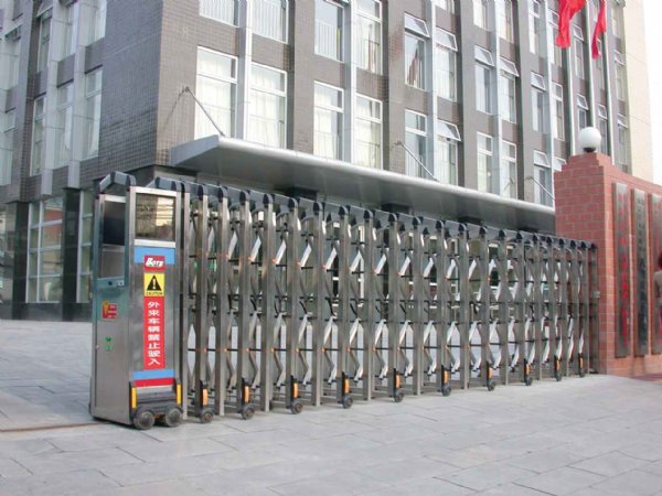 不锈钢及铝合金*型材制作,采用平行四边形原理铰接,伸缩灵活行程大。 伸缩门主要由伸缩门体、机头、控制器三部分组成。