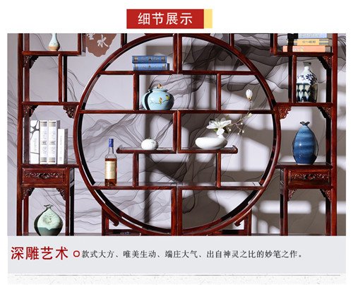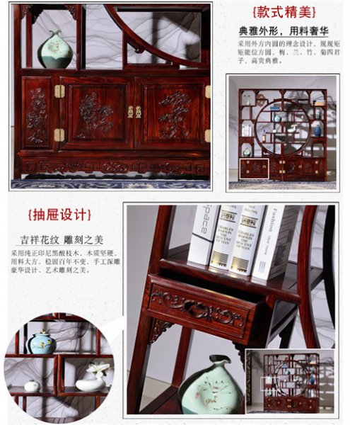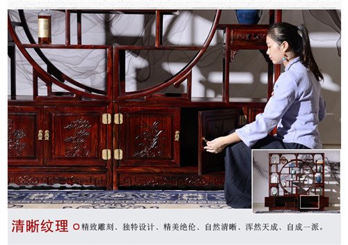 这款博古架展示的是植物花卉的雕刻,采用的木质结构工艺是榫卯结构,没有用一钉,款式精美,纹理清晰。雕花可定制。