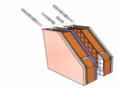 龙骨五层的轻质墙体(其中一层为SUNB隔声板)。SUNB轻质隔声墙非承重墙,墙体6米高以下无需